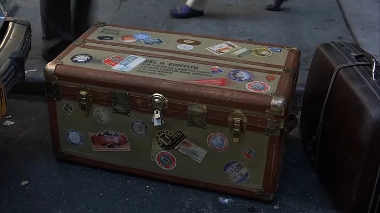 If you’re packing too much for a trip, people might joke that you’re lugging around – or should be lugging around – a steamer trunk. These trunks were used for long journeys at home or abroad from the late 18th to the early 20th centuries. My great-grandfather used one when he brought all of his belongings with him as he emigrated from Europe to the Unites States. The trunks were reinforced and built to last on rough carriage rides, train trips, and/or ocean voyages. All of this makes Del’s use of such a trunk anachronistic even in the 1980s.