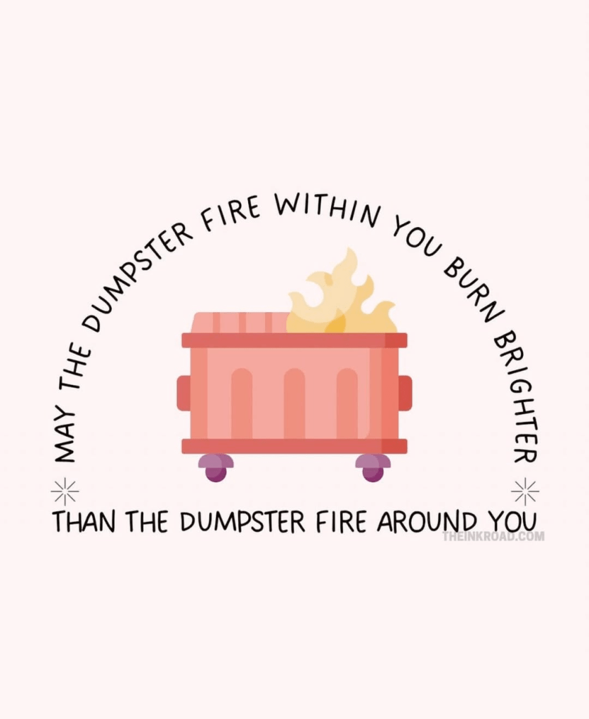 A “dumpster fire” is defined by Merriam-Webster as “an utterly calamitous or mismanaged situation or occurrence.” It’s the description of something so horribly done that it provokes the image of a metal dumpster blazing away with a gigantic fire that shows no signs of stopping. Just as fire grows and consumes ravenously, terrible situations can get out of hand, spread, and destroy all in their path. It’s no good, and yet, memes of a chipper little dumpster fire have taken off, rooted in sarcasm and a heavy dose of irony.