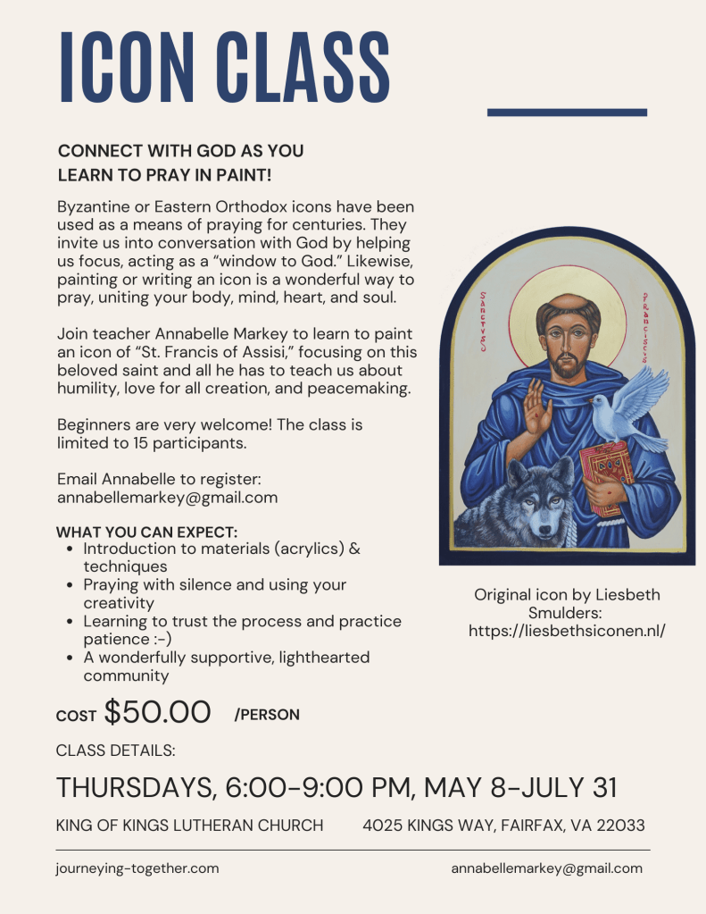 If you are interested in learning to pray in paint, check out the flyer below and please contact me with questions or to sign up via email by April 14. To see some of the previous icons I’ve written and classes have worked on, and to hear about students’ experiences, please view the gallery.